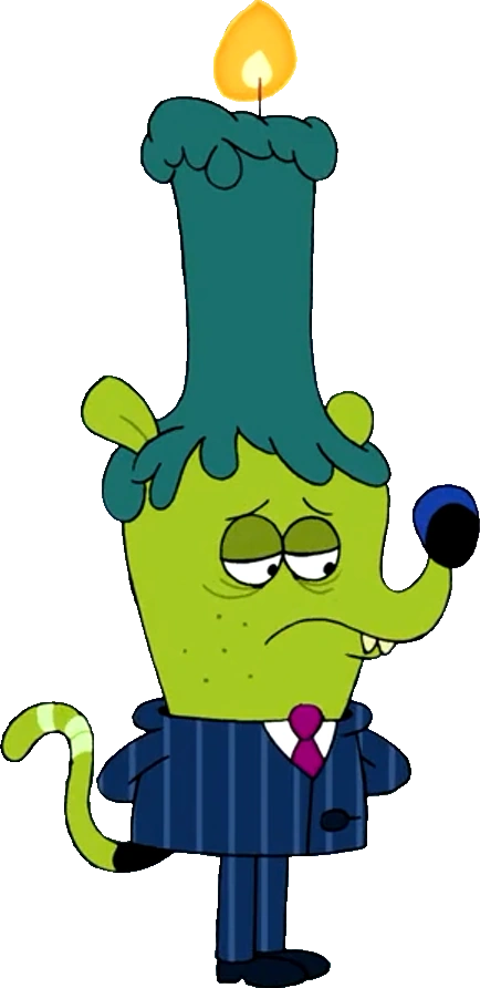 Gorgonzola is a green rat-like creature who has a tеаl wax candle on the top of his head, which is always lit. His ears stick out on either side of the candle. He has a long snout which curves upwards, a large, round, black nose, and two slightly yellowish buck teeth. Often, his eyes are drawn with bags under them with a unibrow.