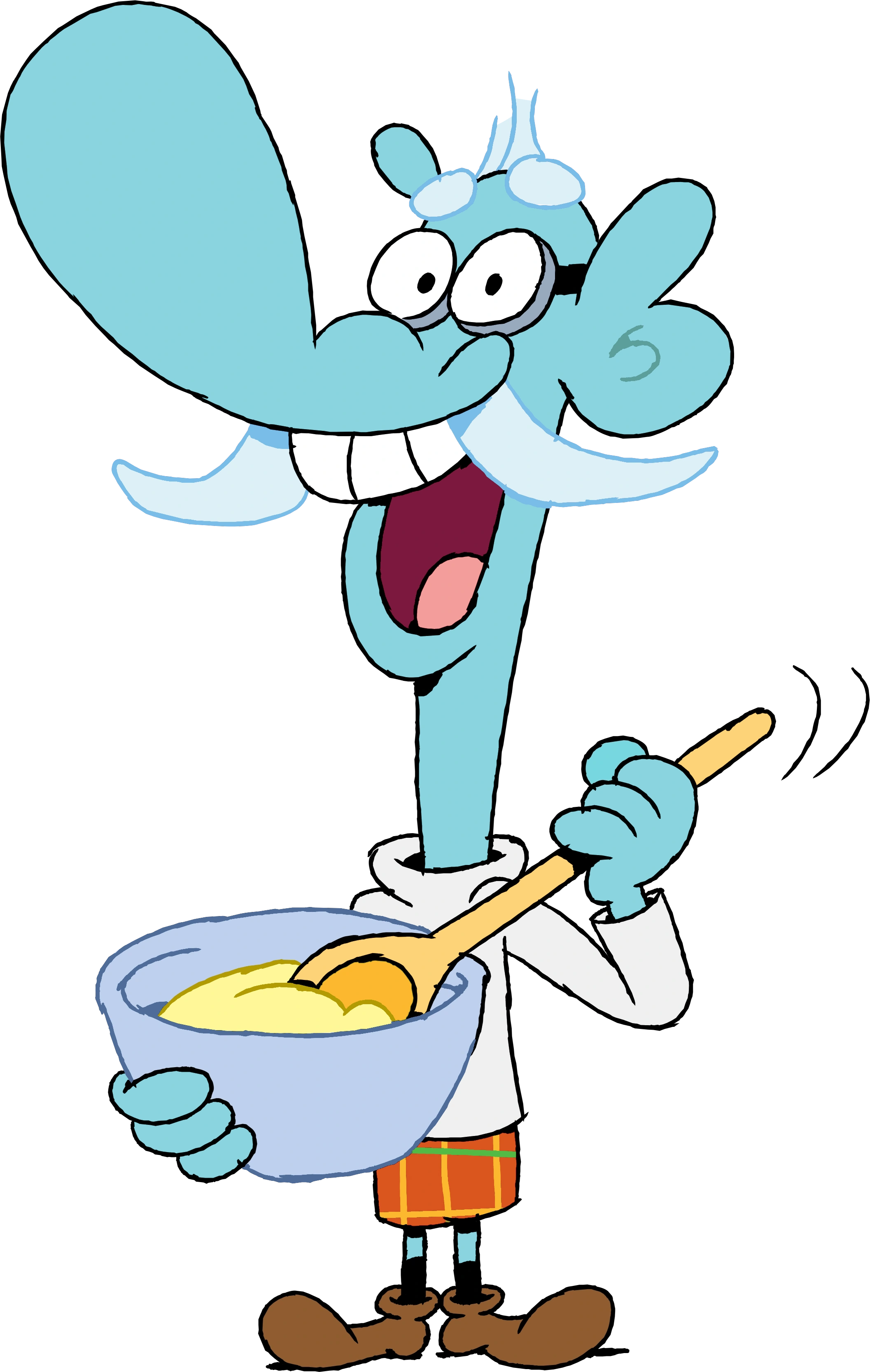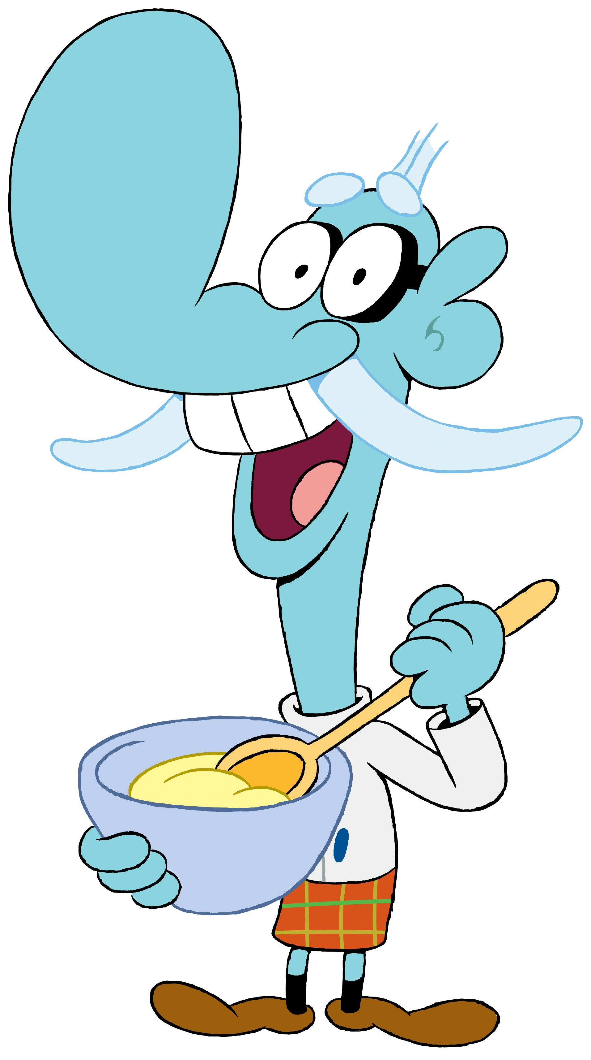 Schnitzel is a hired helper of the catering company, and though he frequently complains about his work, he does appear to care for Mung, Truffles and Chowder, and often uses his immense strength to get them out of trouble. Mung, in turn, considers Shnitzel to be his best friend, although this often results in him being involuntarily dragged into Mung and Chowder's antics.