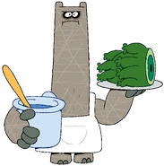Shnitzel (alternatively spelled as “Schnitzel") is the tritagonist of Chowder. He is an employee of Mung Daal Catering who is not only underpaid but has to endure the daily shenanigans of his boss's apprentice, Chowder. Often the straightman of the series, Shnitzel frequently regards Mung's and Chowder's behavior as questionable or bizarre.