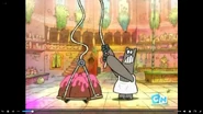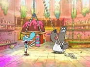 The giant is angry the thousand pound cake is free so he walks to the side of the Earth with the sun and Mr. Capellini has to pay the fee. As further karma for his actions, he has to lift the heavy cake into his house while struggling. Chowder and Schnitzal are happy they got the job done, but a failed attempt at the high five causes Schnitzal to fall off. Chowder returns, but Ming asks him where Schnitzal is. Chowder says he's on his way, appearantly falling down.